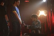 Option 1: Mamud is seen walking in as the crowd swallows Xander and girl. We then see him standing on a table with his guitar playing the solo and the crowd goes wild surrounding him and waving their hands trying to grab him. The band is still playing and we cut back & forth. Quick cuts including sound tech, lights, crowd etc.